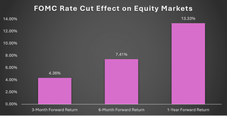 Source: Data from Bloomberg ,12/31/79 through 09/18/2024. Returns are S&P 500 Index returns and are averaged from periods in which the FOMC cut the Federal Funds Rate.
