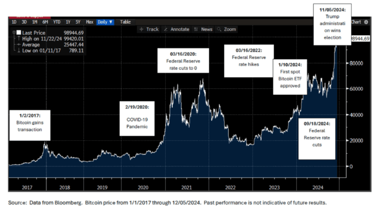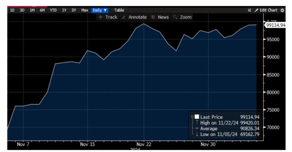 Source: Data from Bloomberg. Bitcoin price from 11/05/2024 through 12/05/2024. Past performance is not indicative of future results.