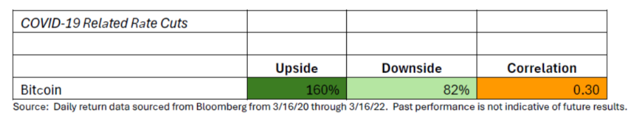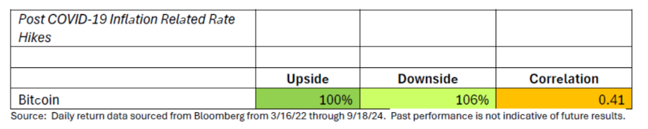 Contrary to the period we just examined, we now look at how the two asset classes behaved during a tightening cycle. In this case, Bitcoin is capturing approximately the same upside effects as equities but with slightly higher downside. Correlations between the two asset classes did pick up a bit during this period vs their long-term average. In our opinion, rising rates certainly appeared to affect both asset classes negatively, and while the downside was modestly higher, we noticed Bitcoin was quite volatile during the period.