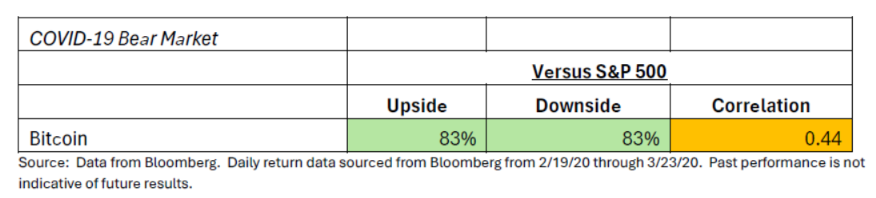 Now we examine how the asset classes responded during the first true bear market of the digital asset’s existence. Its upside is certainly muted relative to the long-term average that we observed above, but its downside is again better. The correlation between the two assets was higher than it has been long-term. We believe this is largely due to the fact that every asset class suffered during the depths of the COVID-19 related bear market. It does seem that, in this case, Bitcoin was able to provide a bit more stability than equities.