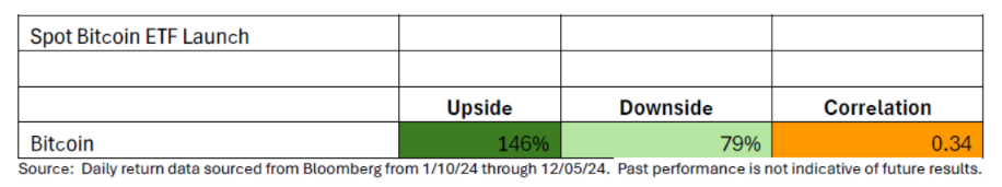 Arguably the most significant event to happen to Bitcoin to date was the approval of the first spot Bitcoin ETF. The Securities Exchange Commission, which had echoed negative sentiment around the concept of crypto currencies, effectively endorsed Bitcoin by approving it to be offered in an ETF wrapper. We believe this created a significant event as ETFs are a heavily used investment vehicle by both institutional and retail investors. We also believe this dispelled the narrative that Bitcoin is a speculative asset. With institutional support with the launch of Bitcoin related ETFs, it seems to have created some type of floor for the price of Bitcoin. As we can see, Bitcoin benefited both to the upside and the downside relative to equities in the wake of this event.